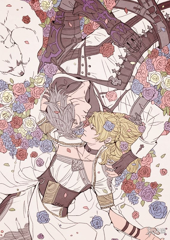 从图片来看,诺克提斯四兄弟睡在鲜花的海洋里,相互依偎拥抱,基情四射,从这些精美的插画里,大家是否闻到了哲学的味道?当然这只是玩笑,第三张瑞布斯和露娜的画面就很唯美。