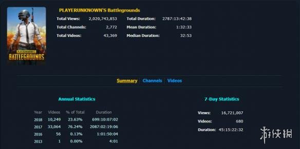 在一年的时间内,2772个游戏频道共产出了43369个绝地求生视频。游戏所有相关视频总时长相加约为66902小时,足够一个人观看7年6月。