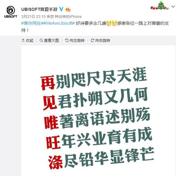 于是育碧得意洋洋地在微博上发了一首(藏头?)诗……