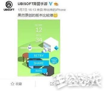于是@UBISOFT育碧手游就在微博上说了这样一句耐人寻味的话:“果然原创的版本比较难。”并配上2016年App Store上线的手游“欢乐跳瓶”,似乎在暗指腾讯的某些举动。