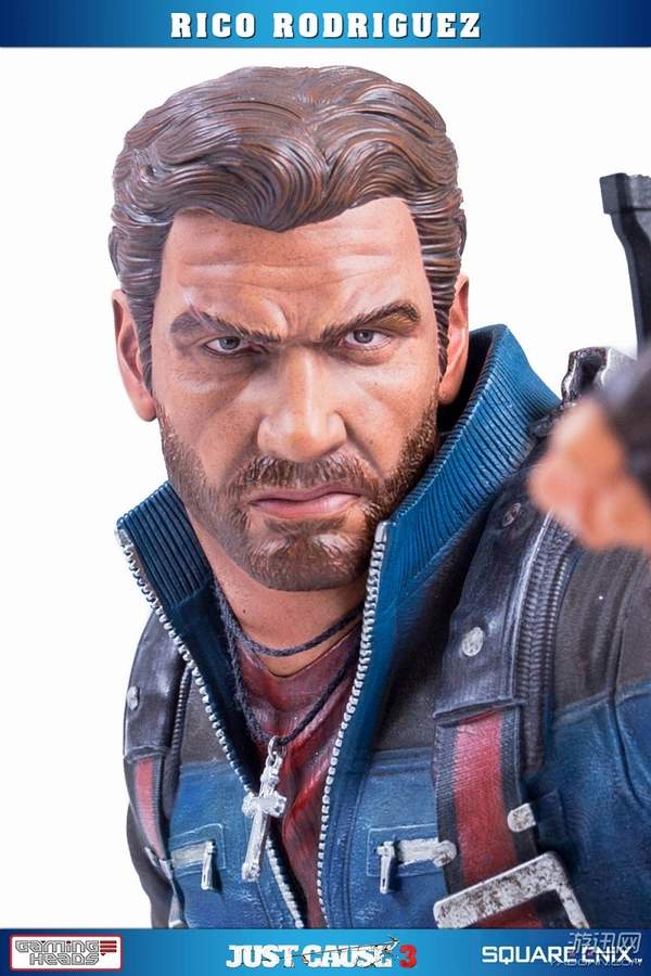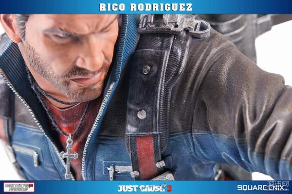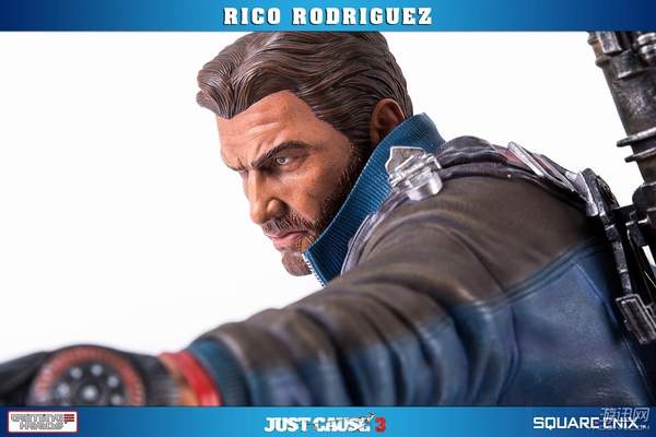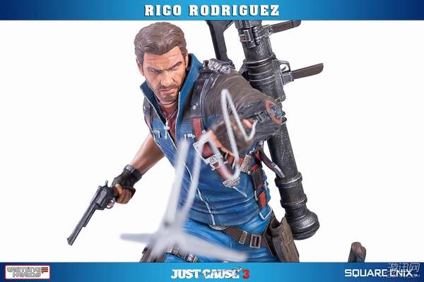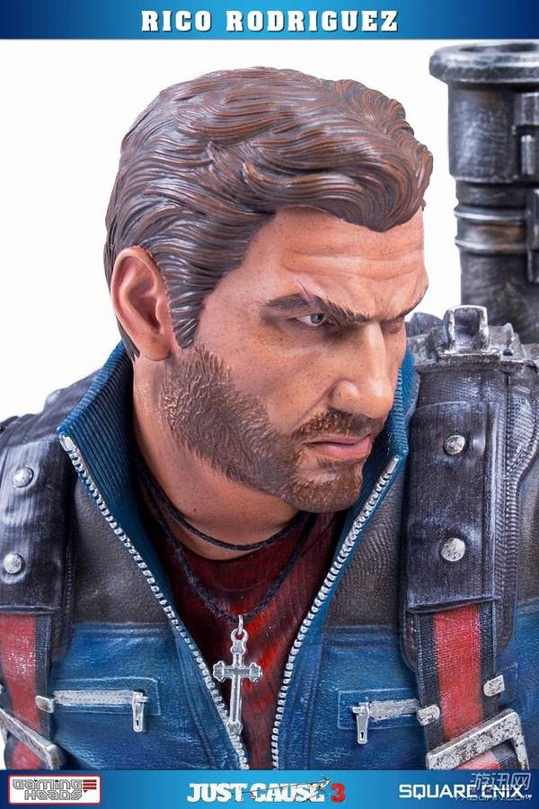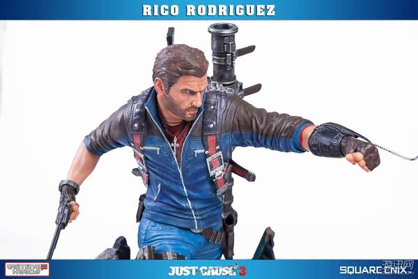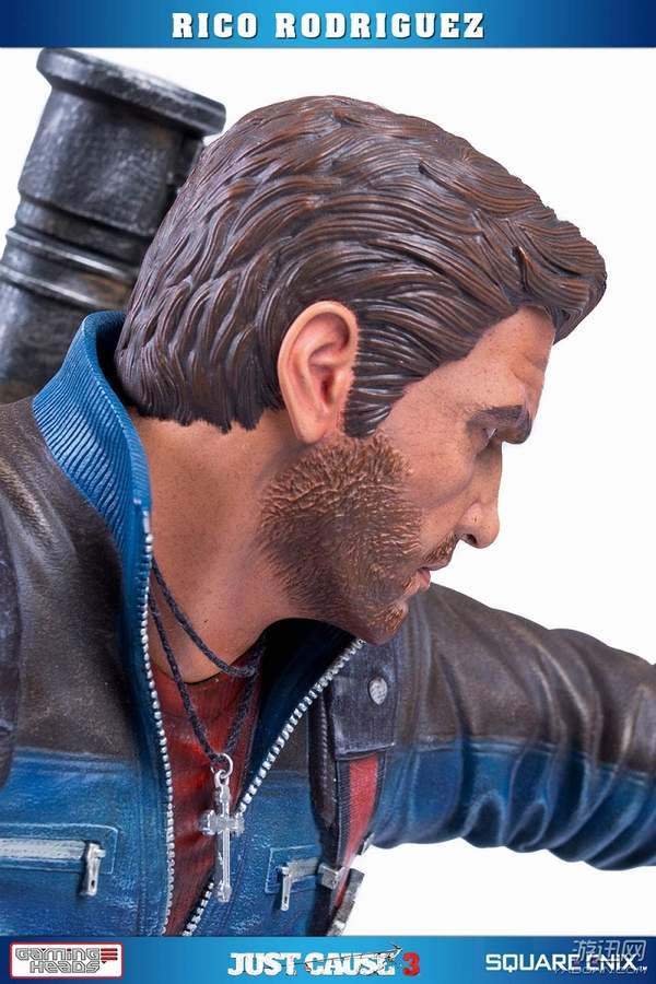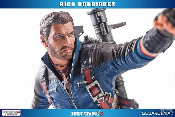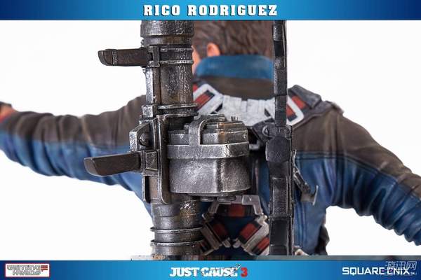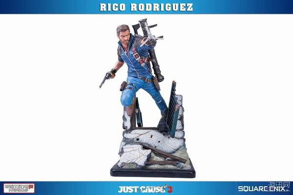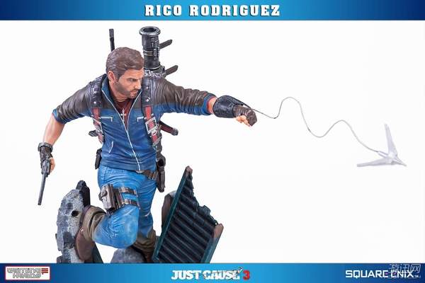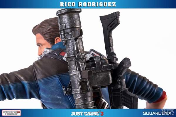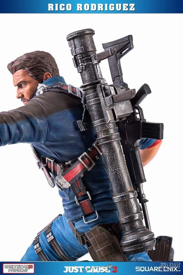 据悉,这款手办高约53厘米,主角Rico Rodriguez的外观完美还原游戏,面部十分精致。他右手拿着一把左轮手枪,背上背着一把步枪和超高出镜率的火箭筒,而左手则是经典的钩爪+鞭子道具。镜头移到他身下踩着的场景,看来是又破坏了一处房屋了。