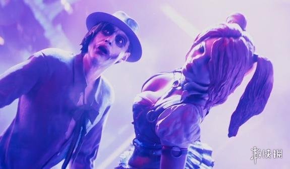 漂浮舞池里,可以看见哈利·奎恩与小丑共舞,这对造型出自DC游戏《蝙蝠侠:阿卡姆疯人院》。(DC是华纳自家品牌,不用白不用)