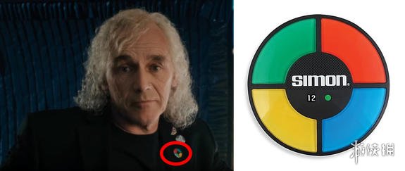 哈利迪殡服胸前挂着的这个四色环形胸章,代表八十年代的记忆力电子游戏Simon。