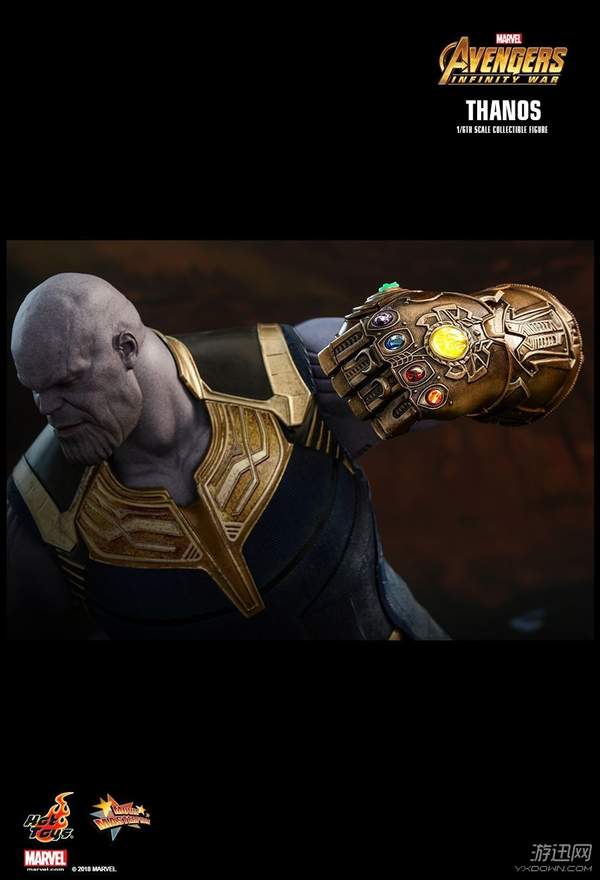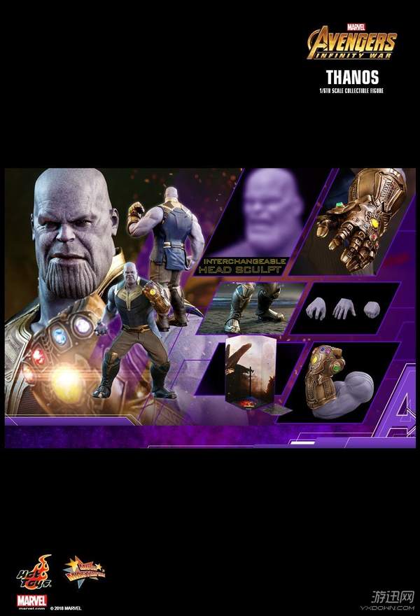 这个灭霸可动手办高约41.5厘米,拥有极其细致的肌肉纹理细节,完美还原灭霸的猛男气质。其中灭霸的头部可以拆,内装两款表情的灭霸头部组件,一个是严肃脸、一个是愤怒脸。除此之外,装满无限宝石的无限手套可以通过内置的LED灯管点亮,非常酷炫,而且还会配备符合电影主题的背景幕。