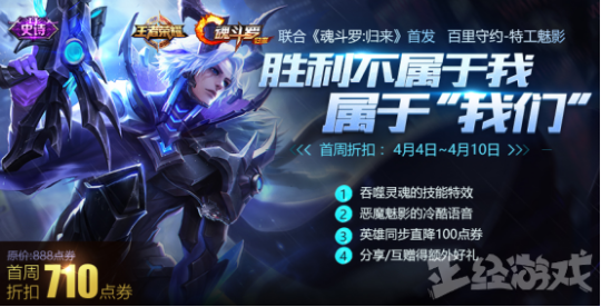 这款由王者荣耀联合《魂斗罗:归来》一起发布的新皮肤,将百里守约幻化成如恶魔魅影般隐匿行动,新技能特效新配音都让这个近期在KPL春季赛场上十分热门的英雄外观形态更加冷酷鬼魅。4月4日至4月10日,原价888点券折扣价710点券。
