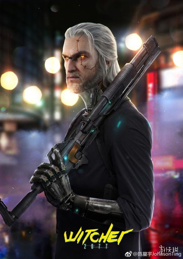 这张图中的白狼,双眼闪烁着黄光,脸上的伤疤也更有科幻色彩,而持枪的手臂已经变成了机械手臂,从颈部来看,似乎杰洛特的整个身体都变成了机械。作者将其命名为“白狼2077”,看来是结合了《巫师》于《赛博朋克2077》,这样的杰洛特真的帅炸了!