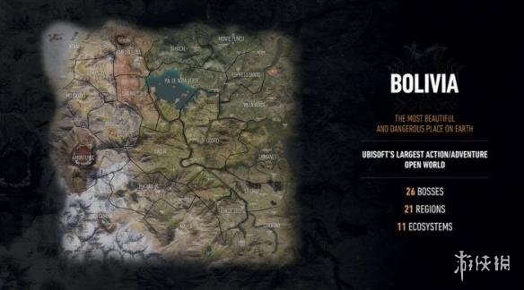 这款游戏是育碧有史以来地图最大的开放世界游戏,在游戏中包括了21个区域。和26个boss。地图横跨沼泽,高山,丛林等11种生态系统。总面积达到了440平方公里,几乎有2个《GTA5》那么大。在游戏中玩家如果仅仅依靠步行,花上一个小时都无法通过全图。