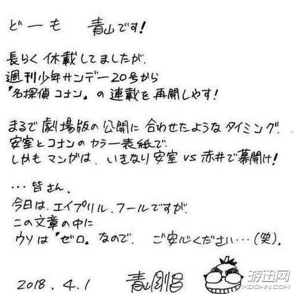 青山刚昌在4月1日愚人节发布了《柯南》漫画复刊的亲笔信
