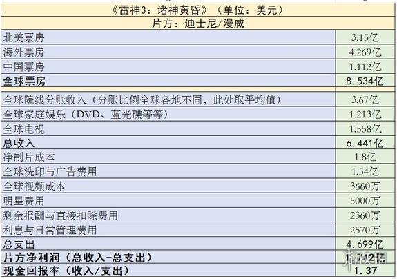 《雷神3》的制片成本从上一部的1700万美元升到了1800万,明星片酬更是由1200万飙升到了5千万!然而净利润却还是拿到了1.742亿美元,远超《雷神2》的1.394亿.至于中国票房,从上一部的5530万美元(约3.47亿RMB)上升到了1.122亿(7.045亿RMB),虽然只有27%会进入片方的口袋,但这103%的涨幅依然十分可观。