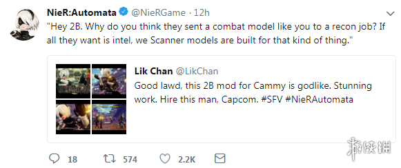 从图片来看,2B mod是根据游戏角色嘉米改的,效果看起来非常棒,人物模型,服装质感甚至超越原作,这名玩家大赞这个mod,呼吁Capcom聘用Mod作者,《尼尔:机械纪元》官方推特也转发分享回应,目前Capcom方面尚无动静。
