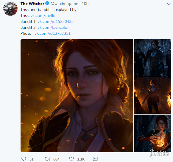 昨天小编给大家带来了一组《巫师3:狂猎(The Witcher 3: Wild Hunt)》特莉丝性感Cos,今天,《巫师3》官方推特再次为我们分享了特莉丝神级Cos图,这次的Cos还带有剧情,美丽性感的特莉丝让强盗想入非非,然而结果却被烧成了灰。