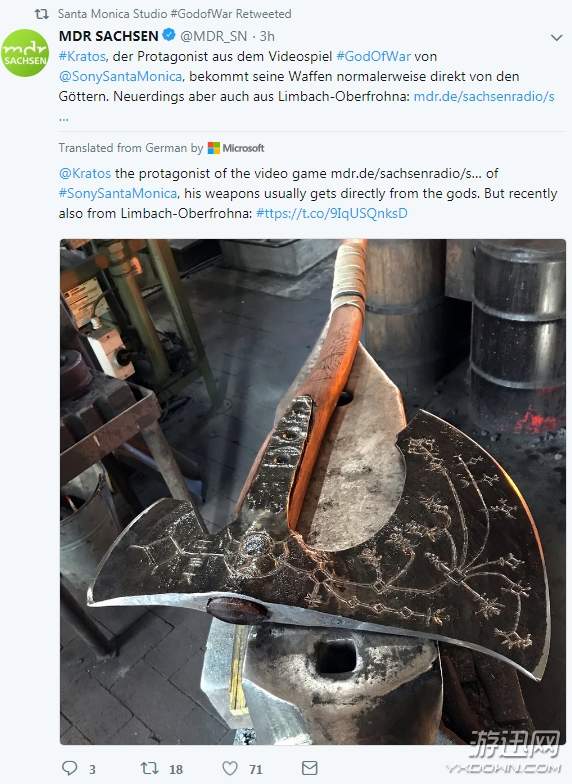推特信息:奎托斯是《战神4》主角,他的武器一般都是直接从神那里得到的,不过最近也从Limbach-Oberforhna这里获得。