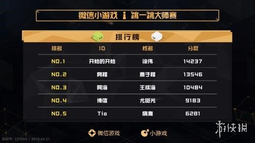 微信小游戏“跳一跳”大师赛于4月21日正式在广州举行,全国的30名跳一跳的顶尖高手齐聚。目前“跳一跳”最高纪录54594分的保持者徐伟以14237的高分夺得了冠军,一起来了解一下吧!