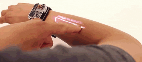 投影机大家肯定都知道,但是手表那么大的你见过吗?美国卡内基梅隆大学的研究人员制作了一块带识别手势操作的投影手表,手指滑动手臂的解锁方式大家都没见过吧。