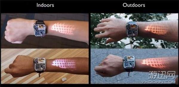 这款名叫LumiWatch的投影智能手表还处在原型阶段,它装有一个15流明亮度的扫描激光投影仪,能够追踪手指2D路径,亮度也足够支持室外使用。为了实现划手臂解锁的酷炫效果,这款手表还搭配了高通1.2GHz四核CPU,768MB的RAM,4GB闪存以及一块740mAh锂电池和蓝牙WiFi模块,它能跑起安卓5.1系统。