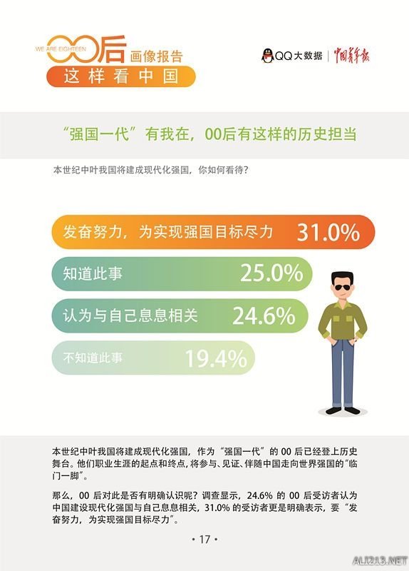 00后对当下中国环境的评价较高,73.1%的受访者认为“中国虽然不完美,但一直在进步”。对于本世纪中叶我国将建成现代化强国的100年战略目标,24.6%的00后认为中国建设现代化强国与自己息息相关,更有31.0%的人明确表示,要“发奋努力,为实现强国目标尽力”。