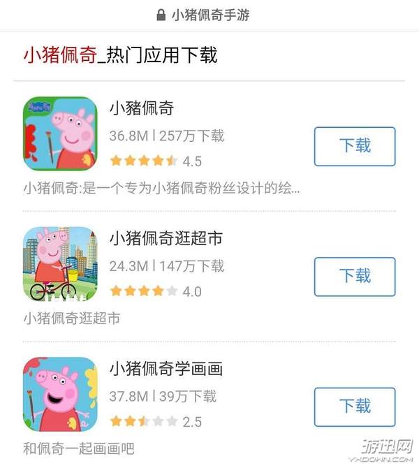如果通过手机搜索“小猪佩奇手游”关键词,会发现部分上述手游产品赫然出现在首页,而且看下载量还不低。最多下载量的手游产品直接叫做“小猪佩奇”,有258万次的下载量,其次小猪佩奇逛超市也有147万次下载。