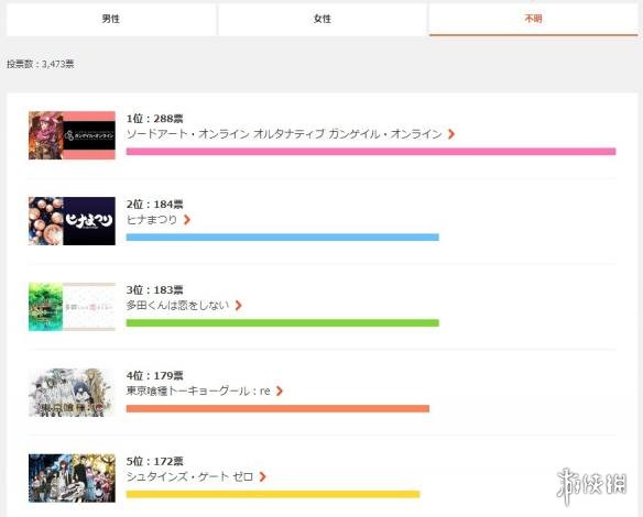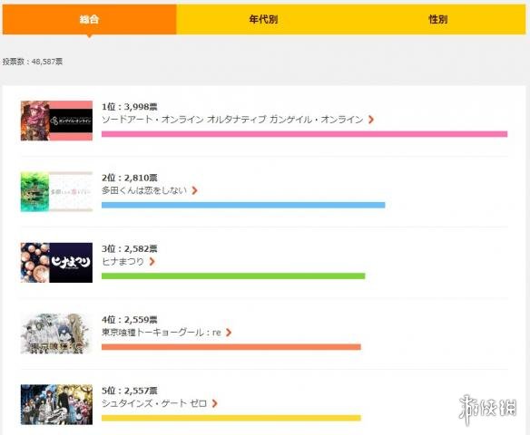 “综合榜”方面,《刀剑神域 Alternative GGO》以3998票的绝对优势位列第一,在此之后的作品分别为2810票的《多田君不恋爱》、2582票的《黑社会的超能力女儿》、2559票的《东京食尸鬼:re》和仅以两票之差位居第五的《命运石之门0》。