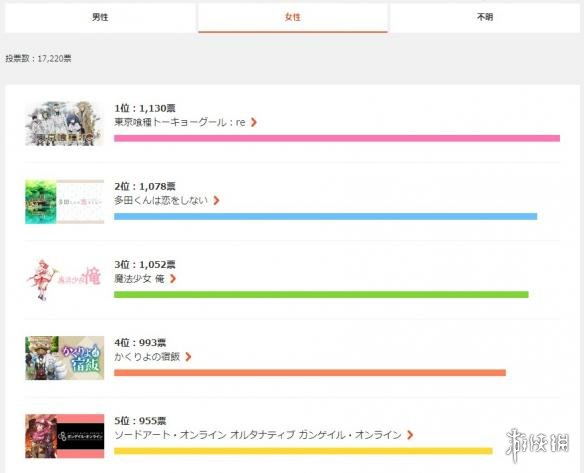 很多女性观众则把票纷纷投给了《东京食尸鬼:re》(得票数1130),之后是《多田君不恋爱》、《魔法少女俺》、《妖怪旅馆营业中》和《刀剑神域 Alternative GGO》,可见与男性观众的口味差异。《魔性之线》、《女神异闻录5》、《鹿枫堂》、《食戟之灵第三季(后篇)》、《冷然的天秤》、《3D彼女》和《敦君与女朋友》等动画的票数也有很多。