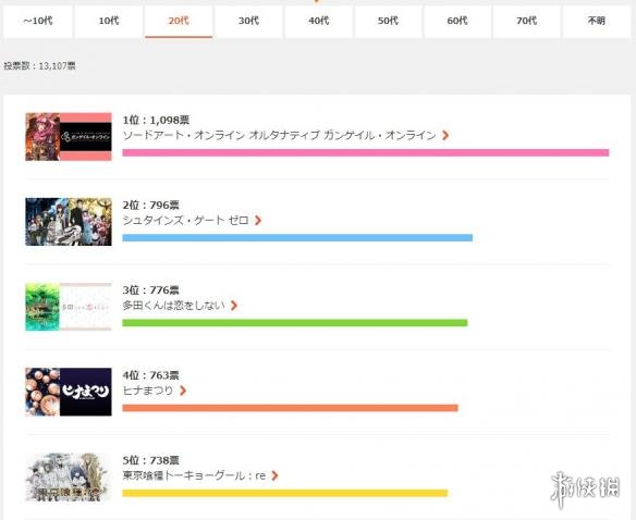 “年龄榜”里,官方将观众群体进一步划分,最小区间为10岁以下(此处投票数为0),最大区间为70岁以上80岁以下。根据结果,除了60岁以上的观众层最青睐《多田君不恋爱》之外,其他年龄层的最高得票作品均为《刀剑神域 Alternative GGO》,可谓各年龄通吃。第一名确定之后,接下来的排位随年龄不同而产生很大变化,比如20岁以下的观众喜欢《东京食尸鬼:re》和《Comic Girls》,而超过30岁的观众更爱看《命运石之门0》和《黑社会的超能力女儿》等等。