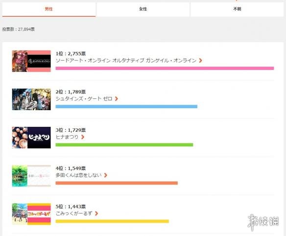 “性别榜”大概是最能体现观众差异的分项了,其中男性漫迷贡献了27894票,女性观众贡献17220票,还有3473票的“性别不明”人士。男性观众方面,位居榜首的依然是《刀剑神域 Alternative GGO》,其次分别为《命运石之门0》、《黑社会的超能力女儿》、《多田君不恋爱》和《Comic Girls》,题材包含了热血、战争、搞笑、爱情和卖萌多个方面。
