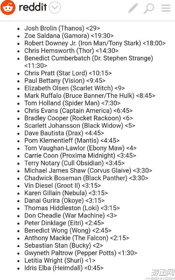 国内《复仇者联盟3》即将上映,今日Reddit网友对影片中各角色出场的时长进行了总结。到底谁才是影片真正的主角,看看这个排名就知道了,灭霸真的是最强反派。