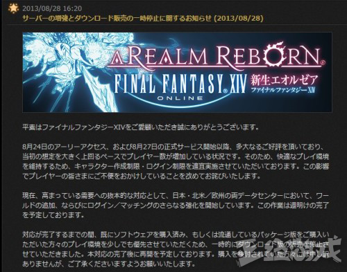 《最终幻想》这个IP在全球拥有180万用户规模、创下了1亿套销量,每一代的发布都吸引了大量的玩家。FF14发布后也是大卖,游戏上线首日玩家大量挤入服务器。不管是日本群组或者是欧美群组的服务器都需要排队进入,有的服务器甚至锁定无法创立新角色,而且玩家购买量越发爆炸。最后官方不得已在脸书上宣布暂时停卖数位版的《最终幻想14》,待服务器扩充后能容纳大量玩家进入才会再度开放。