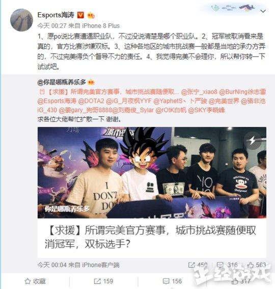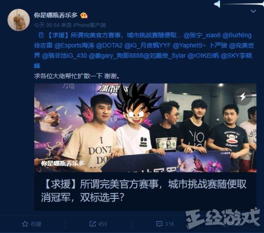 这位博主在5月17日凌晨发布一条长微博,艾特了DOTA2圈子众多大佬,并且标题取“所谓完美官方赛事,城市挑战赛随便取消冠军,双标选手?”