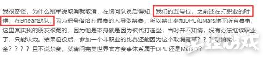 紧接着博主还吐槽了当时赛事管理的混乱以及自己战队明明已经战胜了第二名“职业战队”超音速战队,但是最后冠军和奖金都被取消了。后来得知,博主所在战队的五号位就是一名职业选手,虽然之前在DPL比赛中出现过违规记录。但是博主认为这个赛事并非DPL和Mars,而是完美官方。
