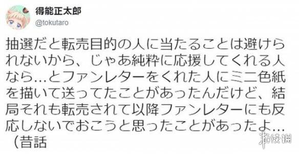 推特上,得能正太郎这样写道:“原本以为抽签或公开发售的签名被转卖不可避免,直到我发现自己为热情粉丝送出的签名插画也被倒卖,结果现在就不准备再回复粉丝们的信件了……”