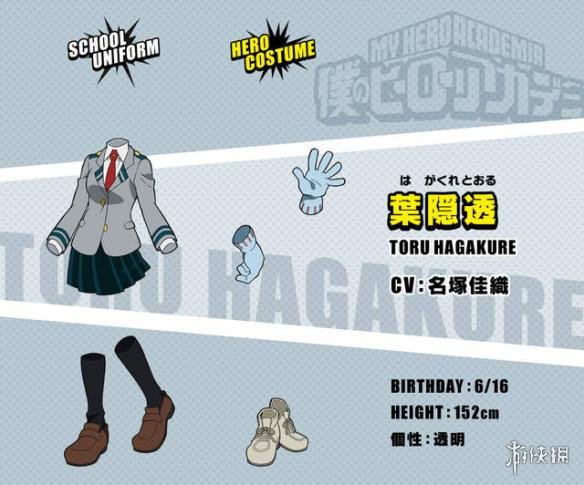 叶隐透在《我的英雄学院》中因为一直都是隐形状态,所以真正的长相没有人知道,贯彻始终一直都是处于隐形的透明少女,在漫画中第62话发表第一次我英人气投票得到第20名,人气也是很高的。