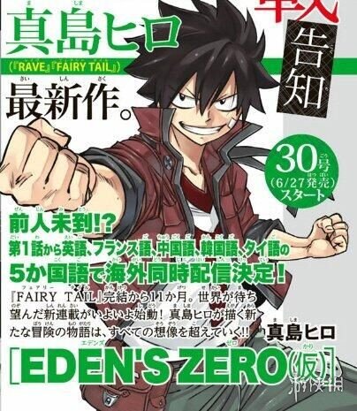 根据情报页透露,真岛浩新作漫画暂定名为《EDEN'S ZERO》,将从6月底开始连载,此外第1话还采用英文、法文、中文、韩文和泰文五种语言在海外读者群中同时发布。从预览图来看,新漫画的男主角有着纳兹的脸和格雷的头发,令人浮想联翩。