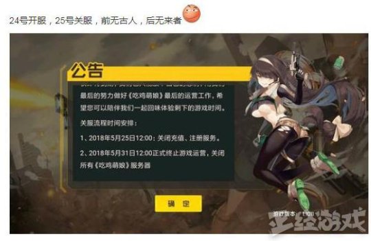 这款名为《吃鸡萌娘》的手游,创造国产游戏史上最快关服记录,5月24日开服,5月25日关服……嗯?你问小弟我为什么放出它的名字来?反正它已经停运了,也没法再圈钱了,大家不妨吐口痰再走吧。