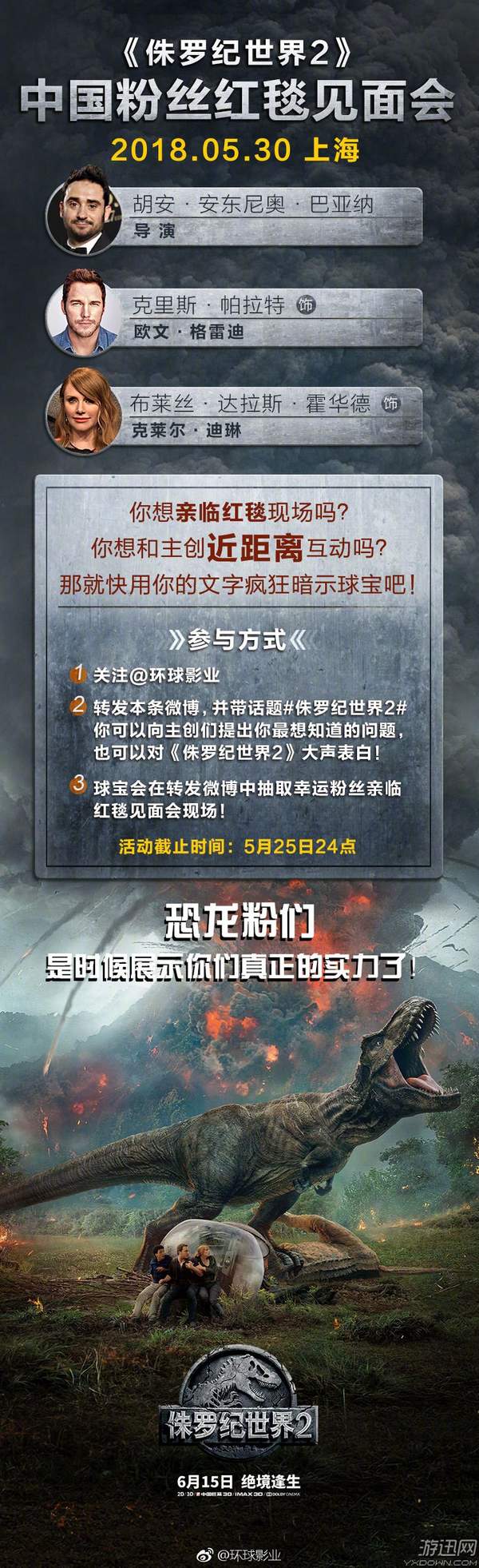《侏罗纪世界2》将于2018年6月15日端午档期正式登陆中国内地各大院线。影片主演克里斯·帕拉特、布莱丝·达拉斯·霍华德,及导演胡安·安东尼奥·巴亚纳已确认出席本片在上海的首映礼。