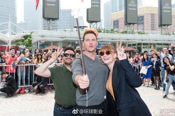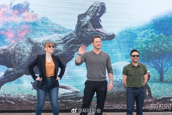 据环球影业中国官微消息,《侏罗纪世界2》三位主创(导演和男女主)昨日空降上海东方明珠为影片宣传造势。现场主创们大玩AR游戏,通过大屏幕与迅猛龙布鲁亲密互动,并邀请粉丝一同体验,主创们还现场教学驯服恐龙的正确姿势。