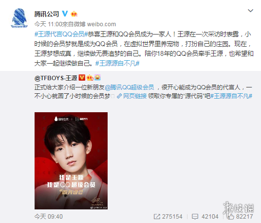 今日,腾讯公司官方微博转发了TFBOYS成员王源成为QQ会员的代言人的消息,并恭喜王源和QQ会员成为一家人!