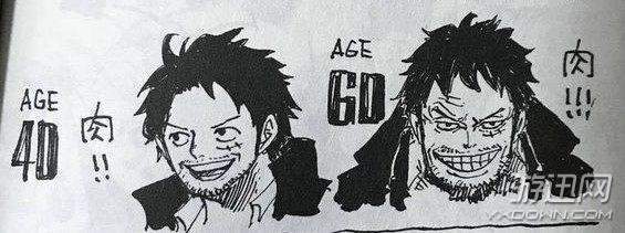 第89卷的SBS版块里,尾田老师分别画出路飞和艾斯成长后的形象,其中40岁的路飞颇有一种红发的气质,60岁时则更像爷爷卡普,唯一的共同点就是不管长到多少岁,路飞依然对肉情有独钟,旁边的台词也简明扼要写道“肉!”,可见大叔路飞的内心仍然充满年轻活力。
