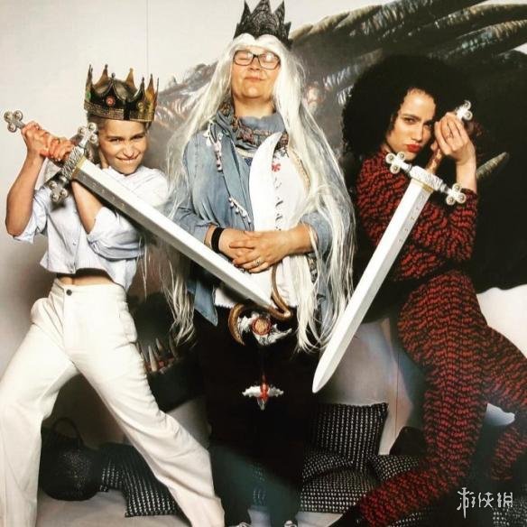 另一张照片中,龙母手持宝剑,头戴王冠,表情搞怪,与弥桑黛一起凹着造型。当然,这种情况下肯定少不了龙母的尬舞场面。