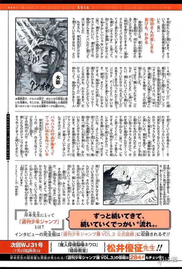 访谈末尾,岸本老师表示自己连载时的《少年JUMP》是“激流”,每位作者都会勇敢投入其中,凭借努力和意志知难而上,这段如同地狱一样的经历令岸本永生难忘。虽然现在《火影》的连载已经结束,但假如被问及还是否会回归这条“激流”的话,岸本老师毫不犹豫回答“会的”,让读者们期待他未来某一天能够带着自己的新作闪亮复出。