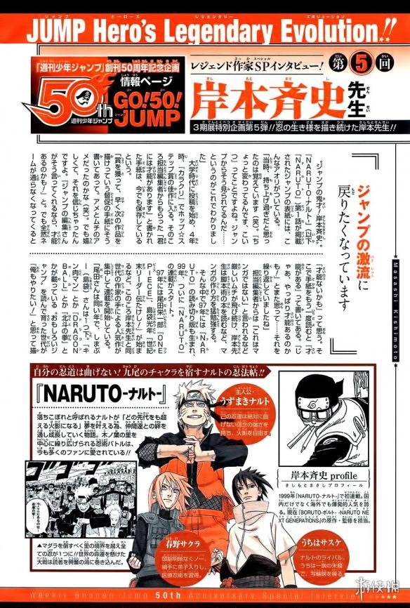 本次50周年纪念访谈里,岸本表示自己“想要重新回到JUMP的激流中”,莫非预示着他接下来将要推出新作?文章中,岸本提到自己大学时代的投稿经历,认为自己并没有创作故事的才能,但有时又觉得自己可以把故事写好,在这样的矛盾心理循环往复之间跻身漫画家行列。