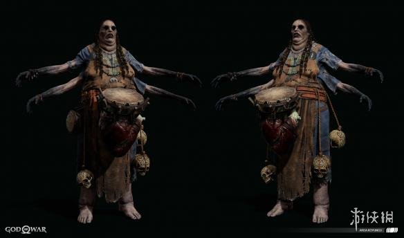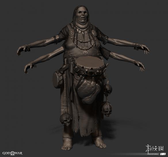 根据索尼圣塔莫尼卡工作室高级角色美工Arda Koyuncu分享的插画,我们看到有一个非常恐怖的敌人,是一个长了四只手的敲腰鼓的巫婆。