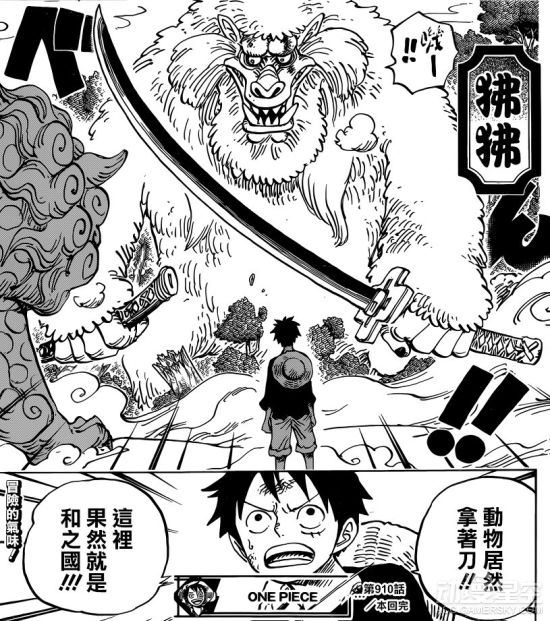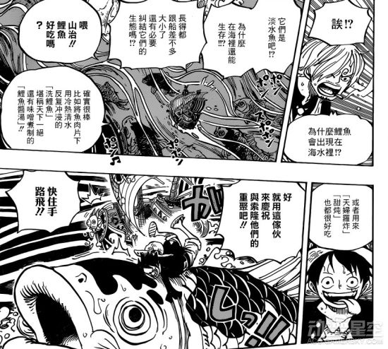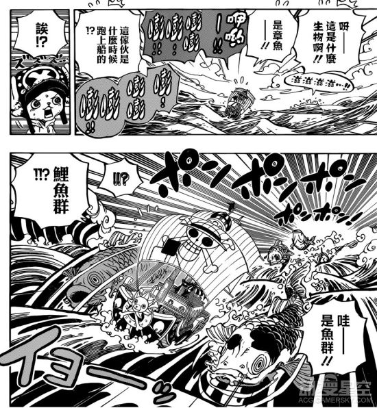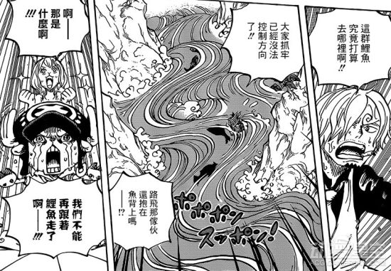 《海贼王》漫画910话汉化版公开,本来以为世界会议篇会再画几话交代一些剧情,但是却在抛出了很多谜团之后,直接来到了和之国,这个剧情真是跳的有点快。在上一话介绍了先去和之国的索隆、罗宾等人的情况之后,镜头终于转向了路飞他们。路飞他们已经顺利离开了大妈的领地,正在前往和之国,不过和之国非常隐秘,想要找到入口并不容易。突然在海面上出现了巨大的鲤鱼鱼群,还有一只奇怪的章鱼不止什么时候爬上了千阳号。