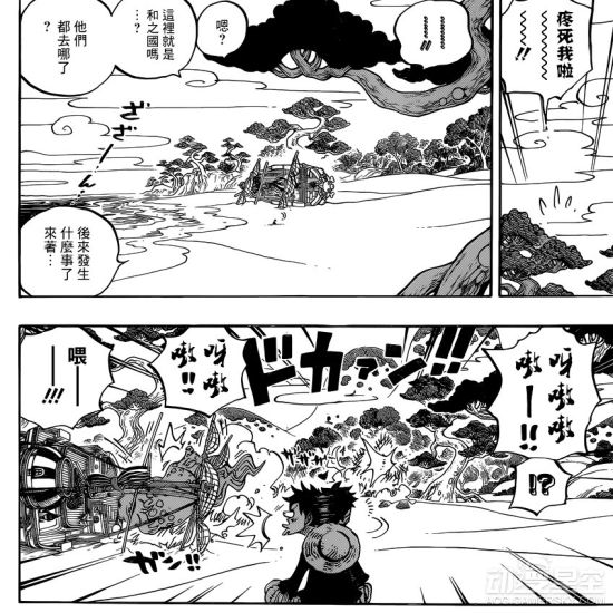 镜头一转路飞和千阳号出现在一处长满松树的海滩之上,然而除了路飞之外其它的人都不见了。这时候一只长相奇特的大狗撞到了千阳号,紧接着出现了一支拿着武士刀的狒狒,路飞断定这就是和之国了。只是不知道具体的方位,还和伙伴们失散,看来路飞要等一阵才能和索隆他们汇合。