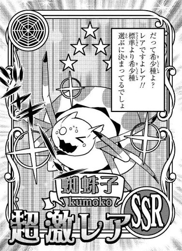而故事主角蛛姐则是26名转生者之一。虽然带着女子高中生若叶姬色(白)的记忆转世,但实际上是教室里被冈崎香奈美救起来后养在教室里的一只小蜘蛛,被D(姑且称作邪神)灌输了若叶姬色的记忆。从最弱级别的蜘蛛魔物开始,靠着自己的根性和干劲一路爬升到了神级的异常存在。