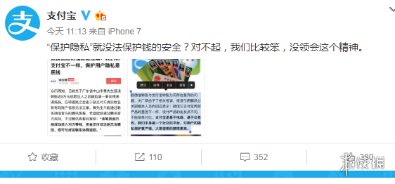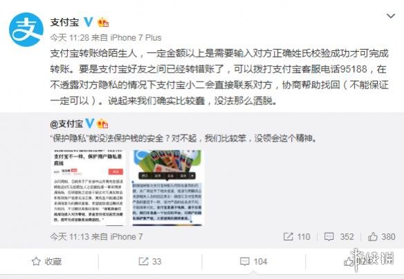 今天上午,支付宝回应此事,表示“'保护隐私'就没法保护钱的安全?对不起,我们比较笨,没领会这个精神。”