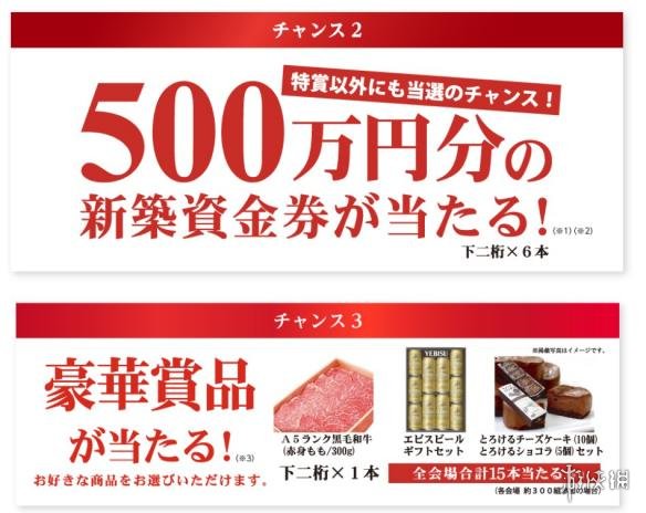 除了这项千万豪宅的特别奖项,还会抽取价值500万日元折扣券以及A5牛肉、yebisu啤酒等豪华套餐。