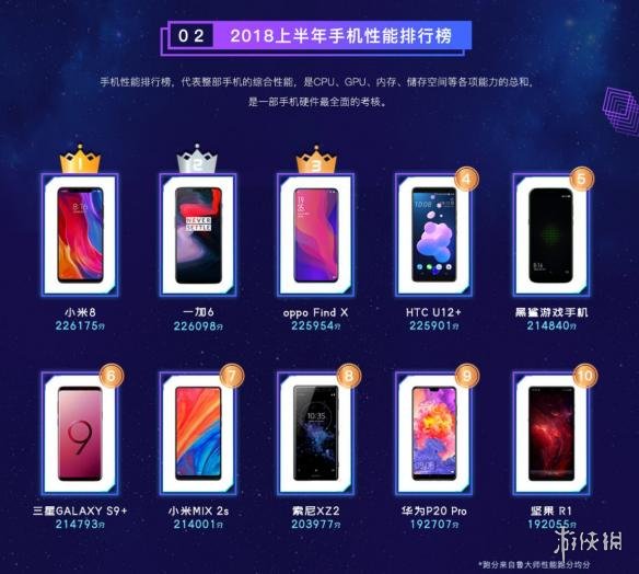 手机性能排行榜代表整部手机的综合性能,其中第一为小米8,跑分226175分;第二名一加6,跑分226098分;第三名oppo Find X,跑分225954分。