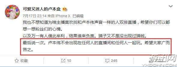说到带节奏,昨晚UU再一次发微博表示最近有主播喜欢找和卢本伟声音一样的人双排直播,这些都跟卢本伟本人无关,卢本伟不会出现在任何人的直播间和任何人一起玩。说白了就是有些小主播想来蹭蹭卢本伟的热度罢了,其实跟卢本伟本人一点关系都没有。