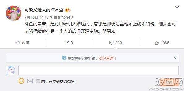 而前两天,UU也在微博对这件事发布了声明,她表示,斗鱼的皇帝,是可以赠送的,意思是即使号主不知情,别人也是可以给他开通贵族的。