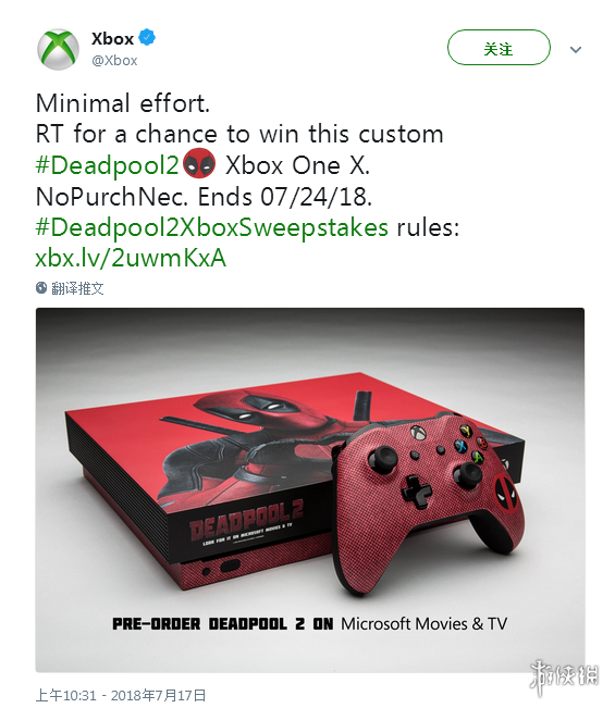 今天,Xbox官方Twitter发文称将以转发抽奖的形式送出下面这台《死侍2》主题的限定Xbox One X主机。是不是很想要呢?一起来看看吧!